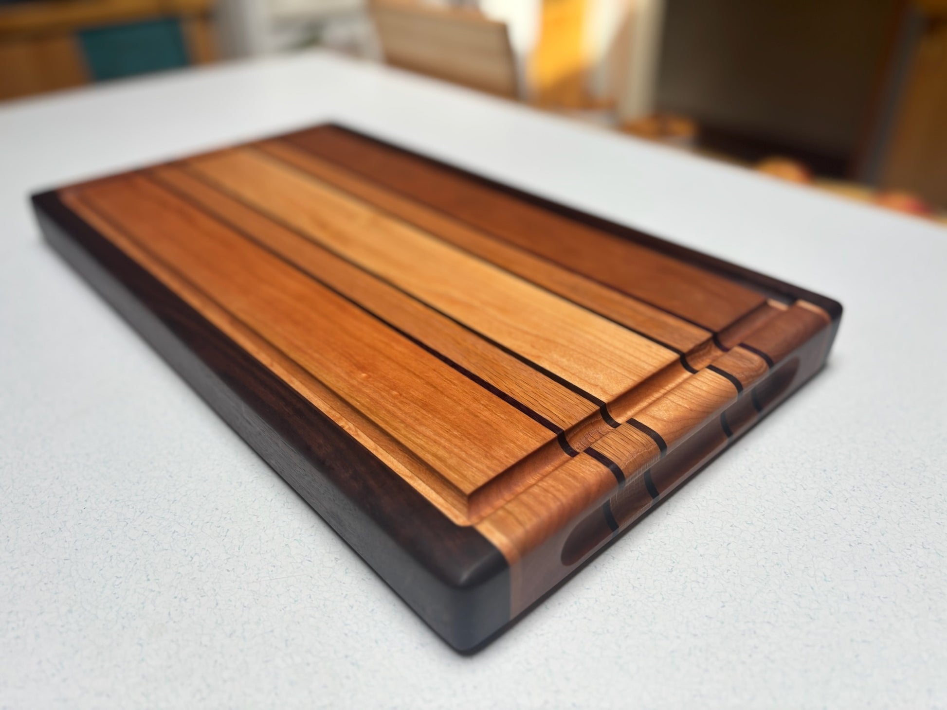 A Medium Sized Striped Patterned Butcher Block with Cherry, Maple, Black Walnut, Red Oak with Black Walnut accents. Juice Well to catch liquids from leaving the cutting surface. Handles on the side of the board for better hold while transporting from counter to counter.